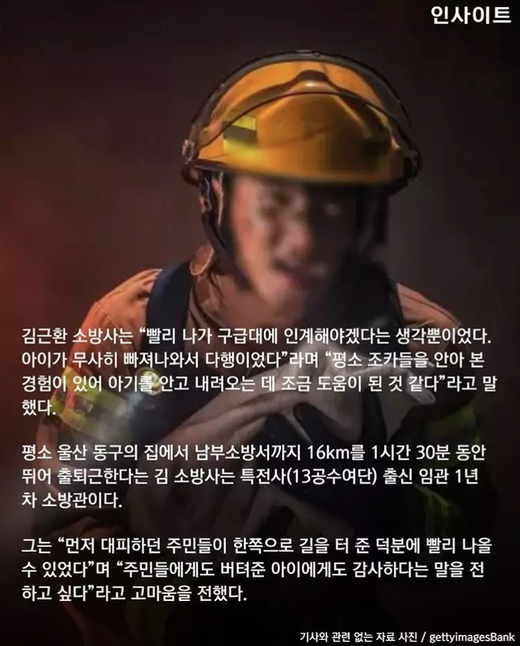 불길 속 아기 안고 22층에서 계단으로 건물 탈출한 막내 소방관