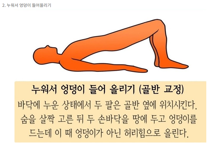 등을 대고 바닥에 누운 상태에서 두 팔은 골반 옆에 위치시킵니다. 이 후 숨을 살짝 고른 뒤, 두 손바닥을 땅에 두고 엉덩이를 서서히 들어줍니다. 허리를 막 들어 무리를 주는 것이 아니라, 엉덩이를 들어올리면서 허리의 척추뼈를 운동시켜주는 방법이에요! 골반 교정에도 좋기 때문에 누워있을 때 자주 해주세요!